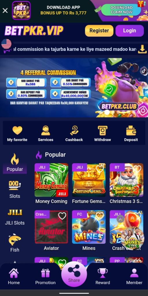 BetPKR Game offers a diverse range of games like Money Coming, Mines, Fortune Gem 3, Aviator, and many more, which give players plenty of ways to earn while having fun, especially with the free bonuses available. This game supports local payment methods, which means players can use their Easypiasa or Jazz Cash account for transactions. Anyone, even a beginner player, can easily make real money because this interface is very easy.
