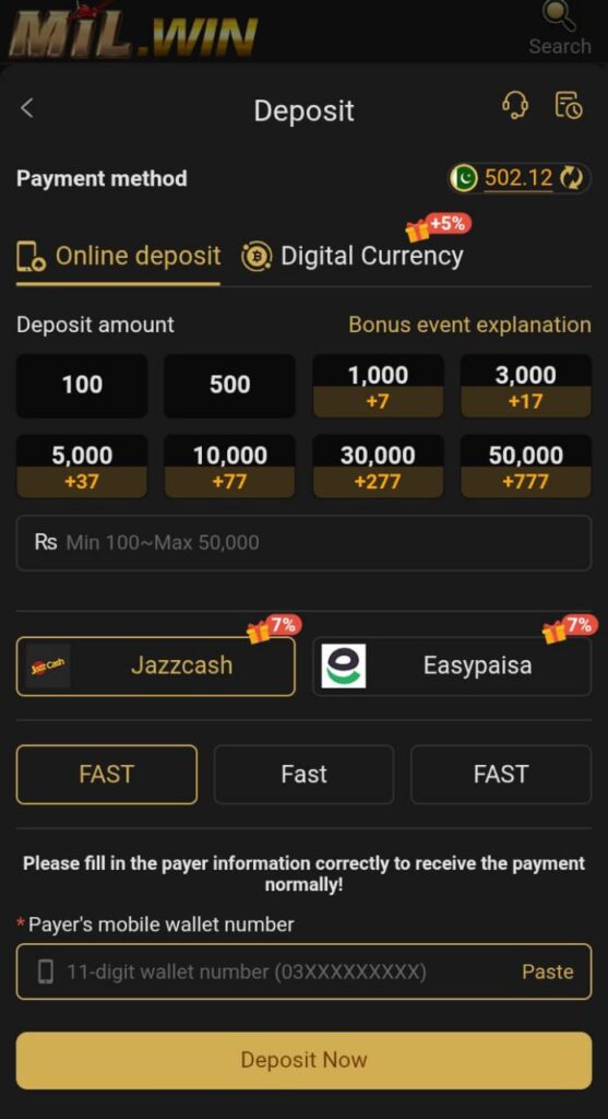Milwin is the only casino game in Pakistan where you can start playing by depositing money within five minutes. The deposit process will not require much time from you because the developer has made it very easy. You only need to enter your number and the amount that you want to deposit. This process is so easy that you will learn it easily the first time and will be able to teach others as well. If anyone is facing any problem, then contact us through the comments and we will help you.