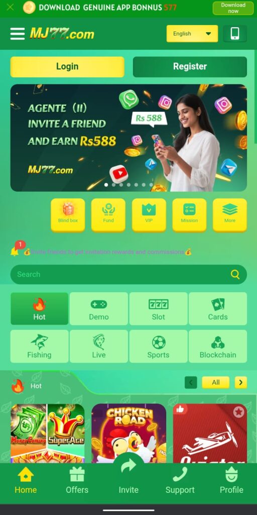 MJ77 Game an online platform that works on Android devices and offers unlimited games. With the quick deposit system, players can directly deposit money from local payment methods and start playing any game. This would be a great choice for all those players who want to earn real money. If you’re looking for a safe and secure online earning platform, then without wasting time, go to the official page and download it now.