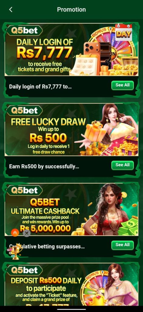 Q5BET Game is Legal in Pakistan and supports local payment methods like EASYPIASA and Jazz Cash. Now players can easily deposit and withdraw money from this exciting game. It offers fun and brings more bonuses, for example, daily bonus, weekly bonus, and monthly bonus. Free spins can also boost players’ balance, and players can easily convert a small balance into a big amount by playing easy games.