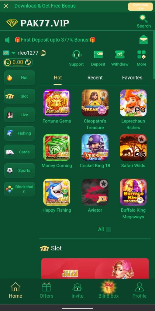 Pak77 Game Online is a free online earning application, and the download link is available on the official website. After downloading this fabulous game from the official website, players can easily earn real money by playing different types of easy games. For example, players can make a bet on games like Money Coming, Mines, Fortune Gem 2, Jili Fish, Teen Patti, and many others. This is a great opportunity for everyone. Even if you are young, you can download this game. Even if you are working in the office, you can download it, or even if you are sitting at home without doing any work, you can download and play this game. There is no age limit in this game. You don’t have to put your personal data during registration.