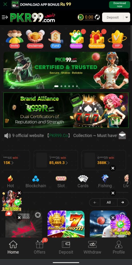 PKR99 Game is a new earning app and due to its unique features has become famous in Pakistan. Millions of people have already downloaded it from the official website and are making money. This small-sized app brings more joy and entertainment. Players can also participate in live matches and different live events. The HD Graphics and best sound effects make this game more enjoyable. We recommend that you download it and deposit money to enjoy.