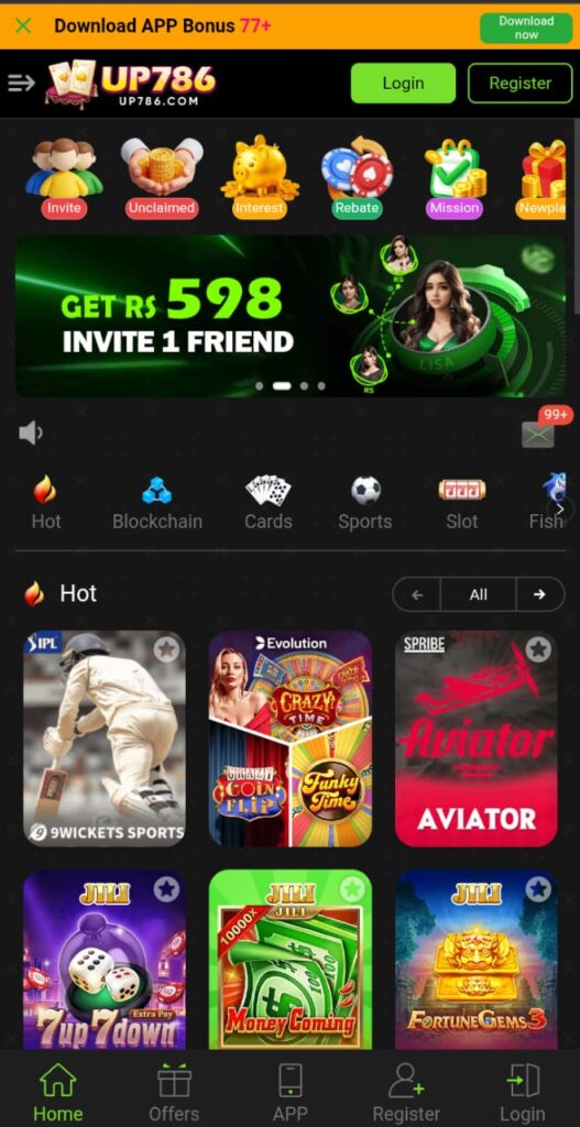 UP786 Game is a free online platform specifically designed for Android users and is gaining popularity in Pakistan. After creating an account, users can play a wide range of games, including Drogon Tiger, Teen Patti, 9Wickets Sports, Chicken Road 2.0, Blockchain Games, 7 Up 7 Down, Aviator, and many more.
